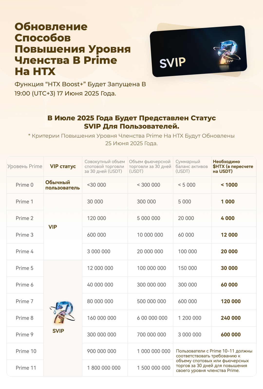 После запуска функции “HTX Boost+” 25 июня 2025 года в 05:00 (UTC+3) будут обновлены способы повышения уровня членства Prime. Подробная информация представлена ниже: