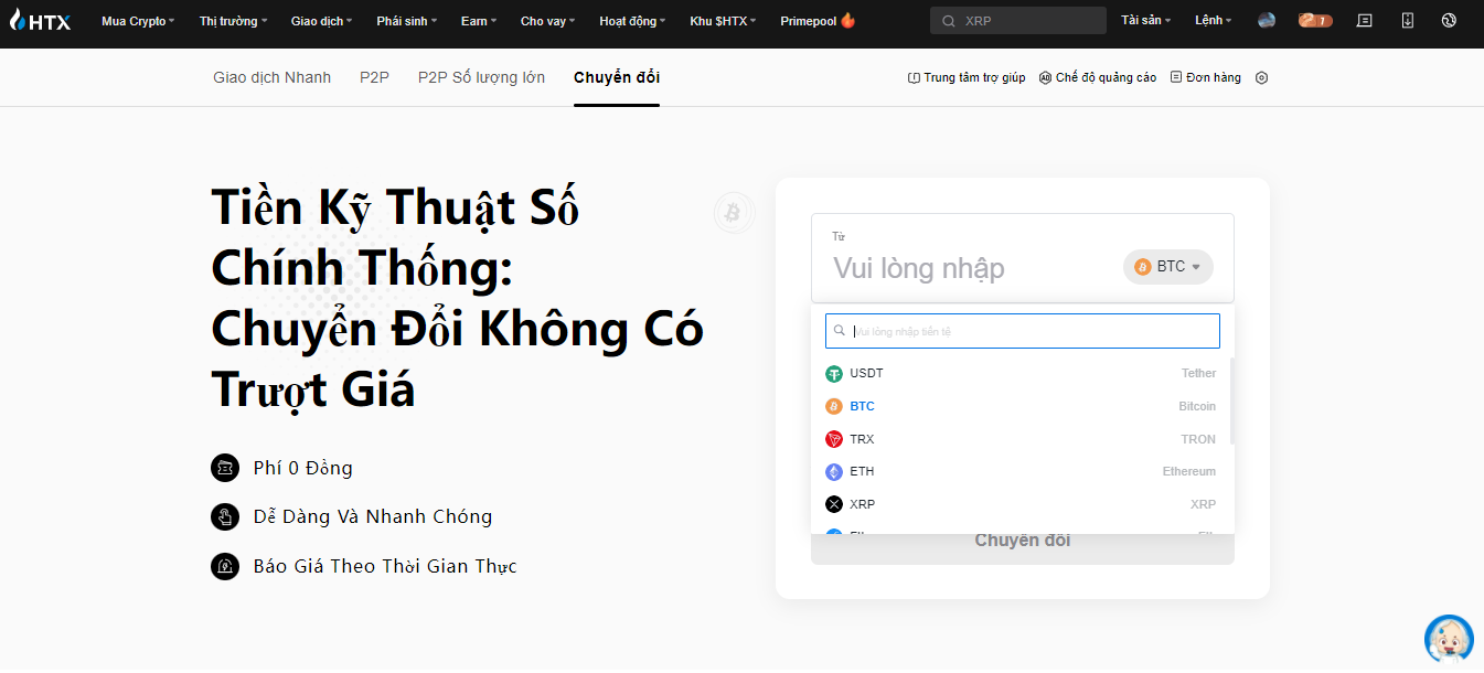 HTX Chuyển đổi là một công cụ đơn giản cho phép bạn mua và bán tiền kỹ thuật số chỉ bằng vài cú nhấp chuột. Hỗ trợ trao đổi trực tiếp giữa nhiều cặp tiền tệ, cho phép bạn dễ dàng chuyển đổi số lượng tiền kỹ thuật số bất kỳ sang số lượng tiền kỹ thuật số khác.