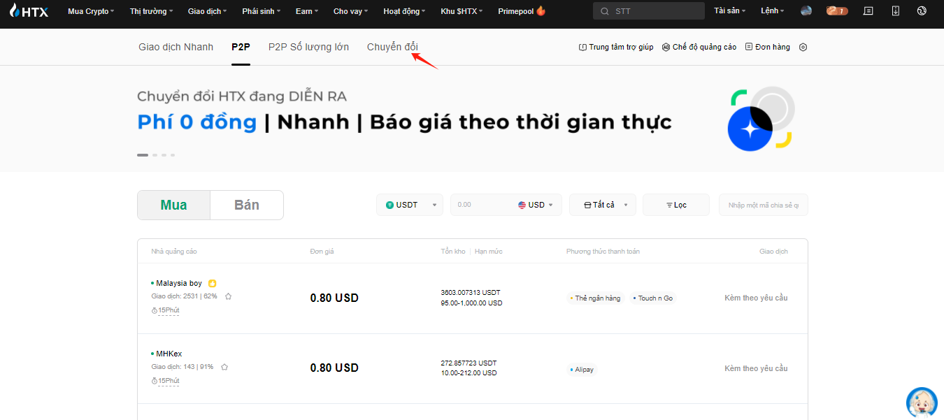 1. Đăng nhập vào tài khoản HTX của bạn, vào Mua Crypto hoặc Giao dịch, sau đó bạn sẽ tìm thấy tính năng Chuyển đổi.
