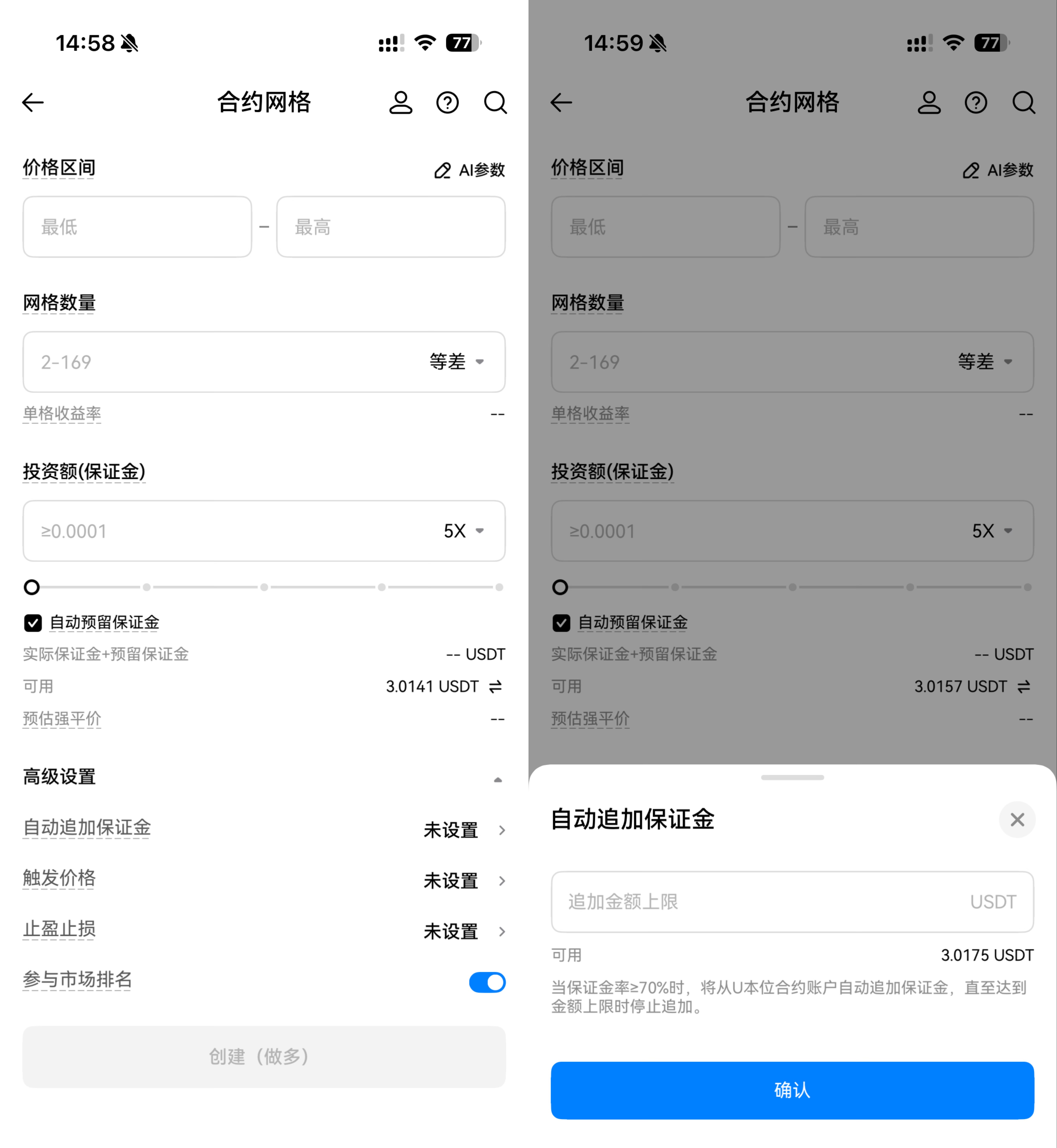 - 设定上限:创建合约网格时,在高级设置中,点击设置“自动追加保证金”首先设定一个“自动追加保证金上限”。这代表了您愿意为该策略最多补充的资金额度。系统会在触发条件时,自动从U本位账户划转资金,直到保证金率回归安全水平或达到此金额上限。建议设置金额不超过U本位账户的可用余额,以免影响其他仓位。