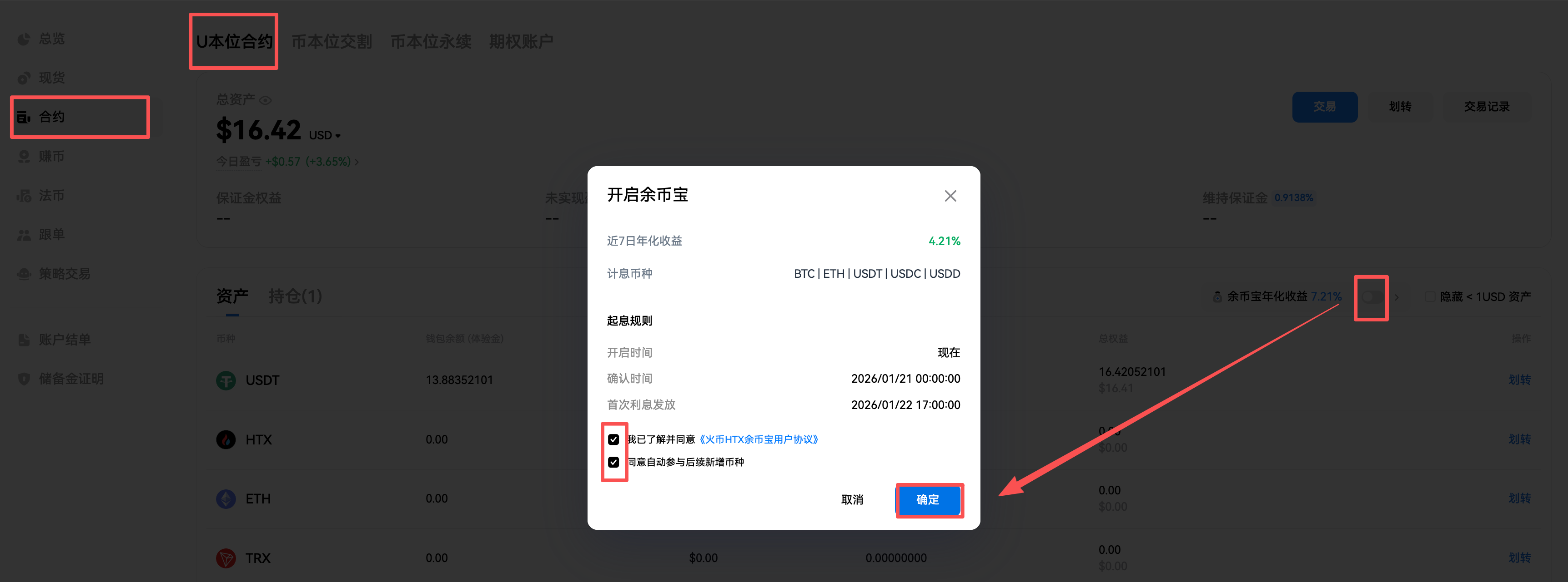 【方法二】合约资产页余币宝banner区点击开启按钮,在弹框内阅读协议后勾选同意,并且勾选”自动参与后续新增币种”,最后点击”确定”即可