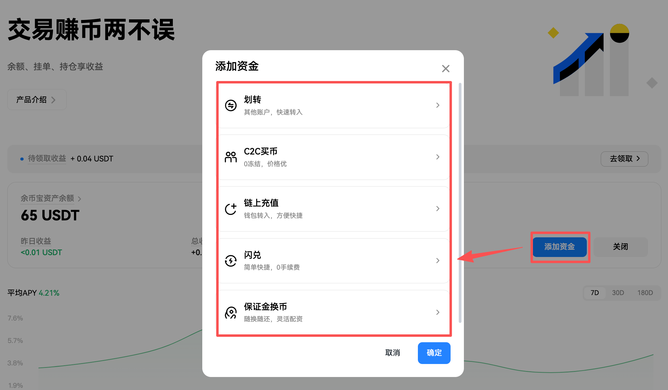 当余币宝支持的币种在现货账户内无余额时,余币宝产品主页会展示”添加资金”按钮。点击后可选择从非现货账户划转资金至U本位合约账户,也可以选择C2C买币/链上充值/闪兑/快捷交易/保证金换币等方式最后将资金转入U本位合约账户内。