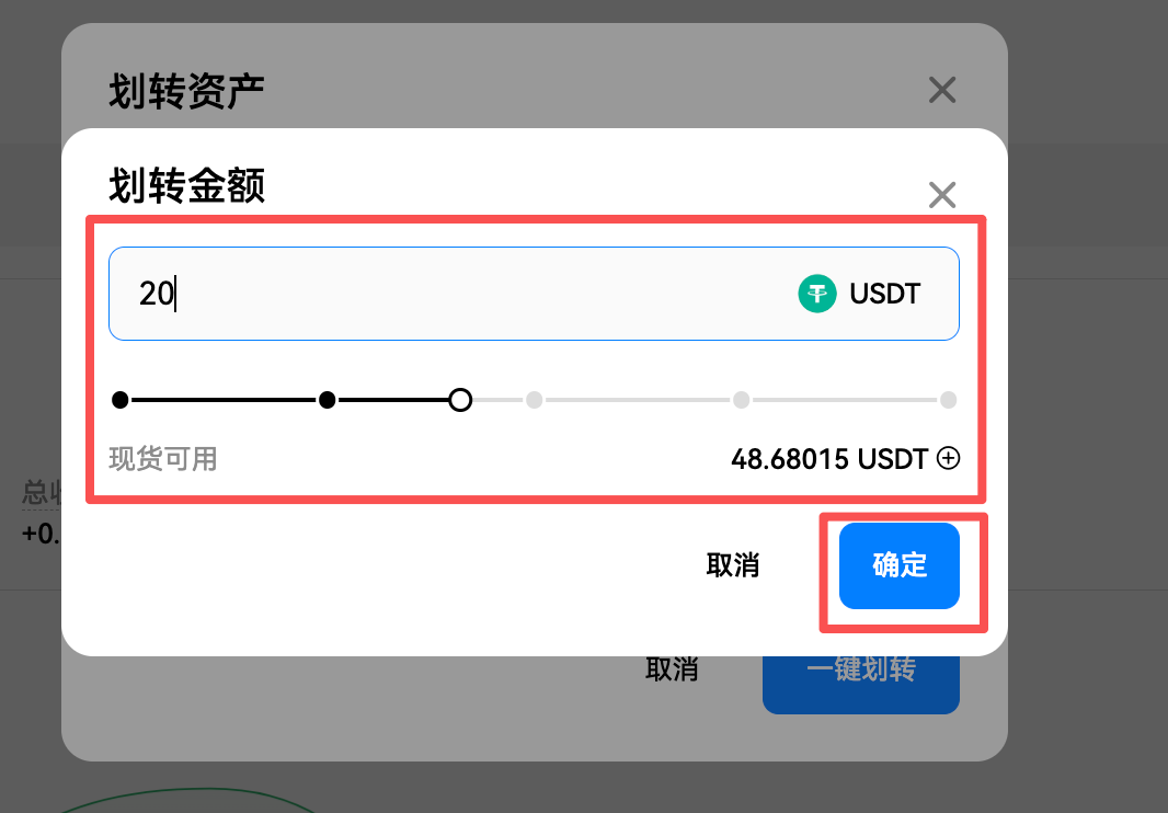 当余币宝支持的币种在现货账户内有余额时,余币宝产品主页会展示”划转”按钮。点击划转后进入浮窗,系统默认勾选全部可转币对,划转数量默认为现货账户最大可转出金额。您可选择需要转入的币种,也可以点击币种旁边的编辑按钮去独立配置每个币种转入的金额。设置完成后点击”一键划转”即可。