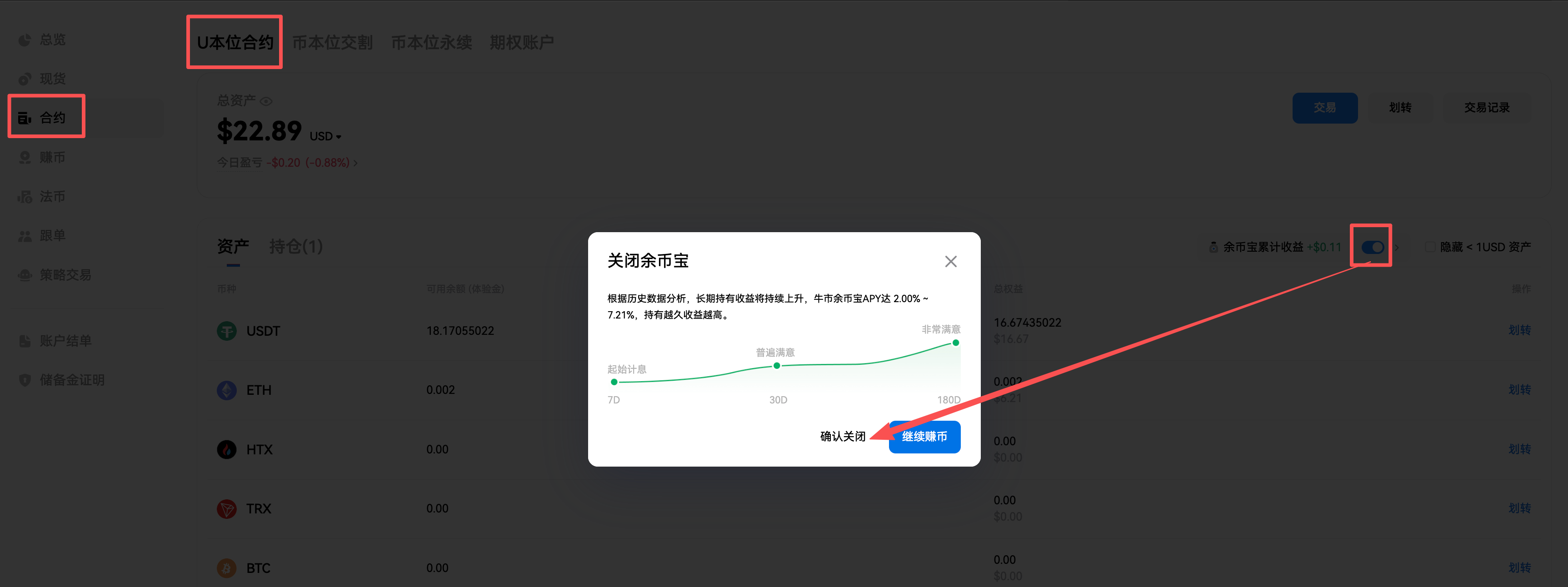 【方法二】进入资产--合约账户-- U本位合约账户,将余币宝banner区的余币宝开关设置为关闭即可关闭余币宝功能