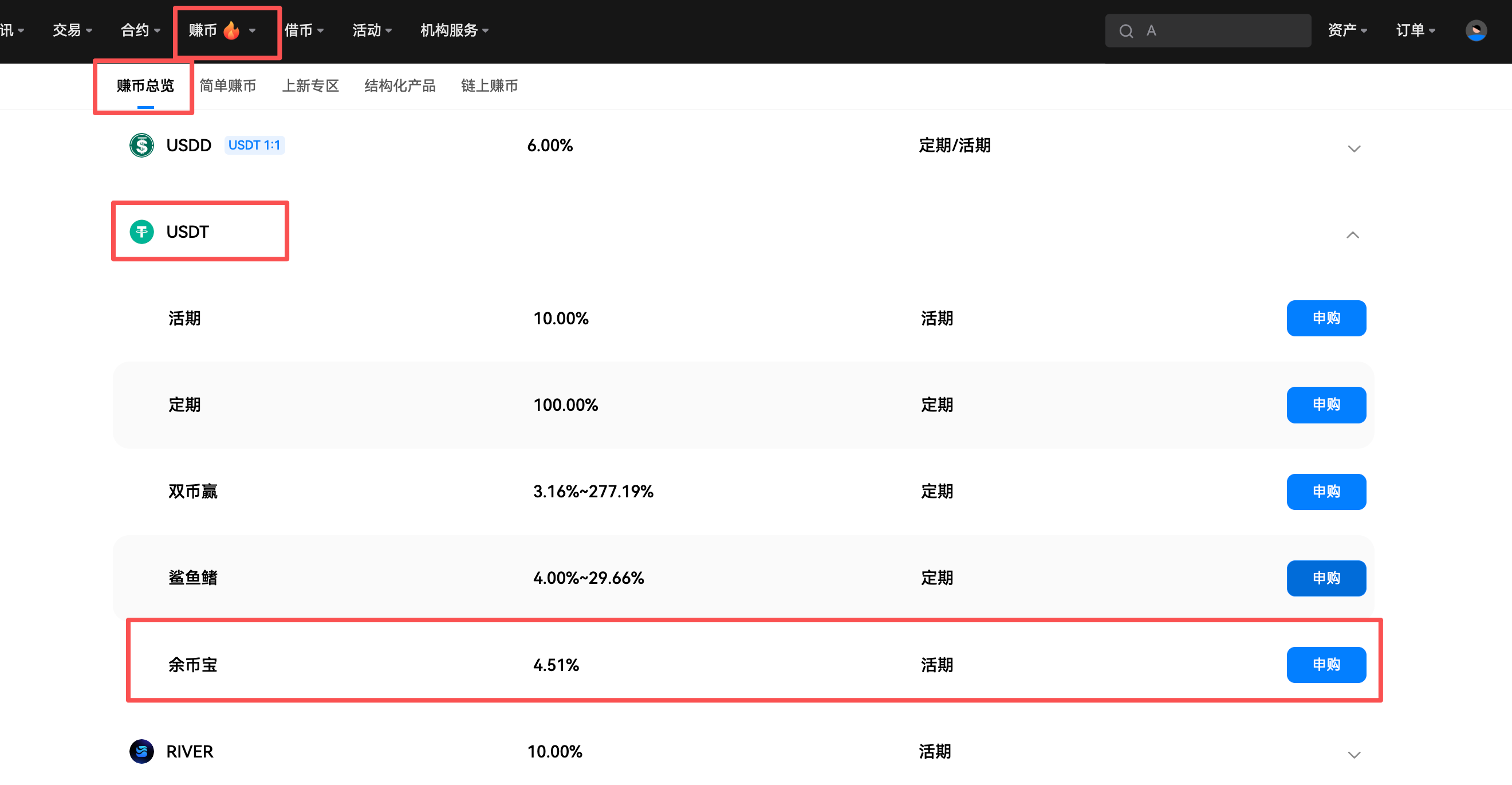 3)主页顶部导航栏--赚币总览-- USDT--”余币宝”入口
