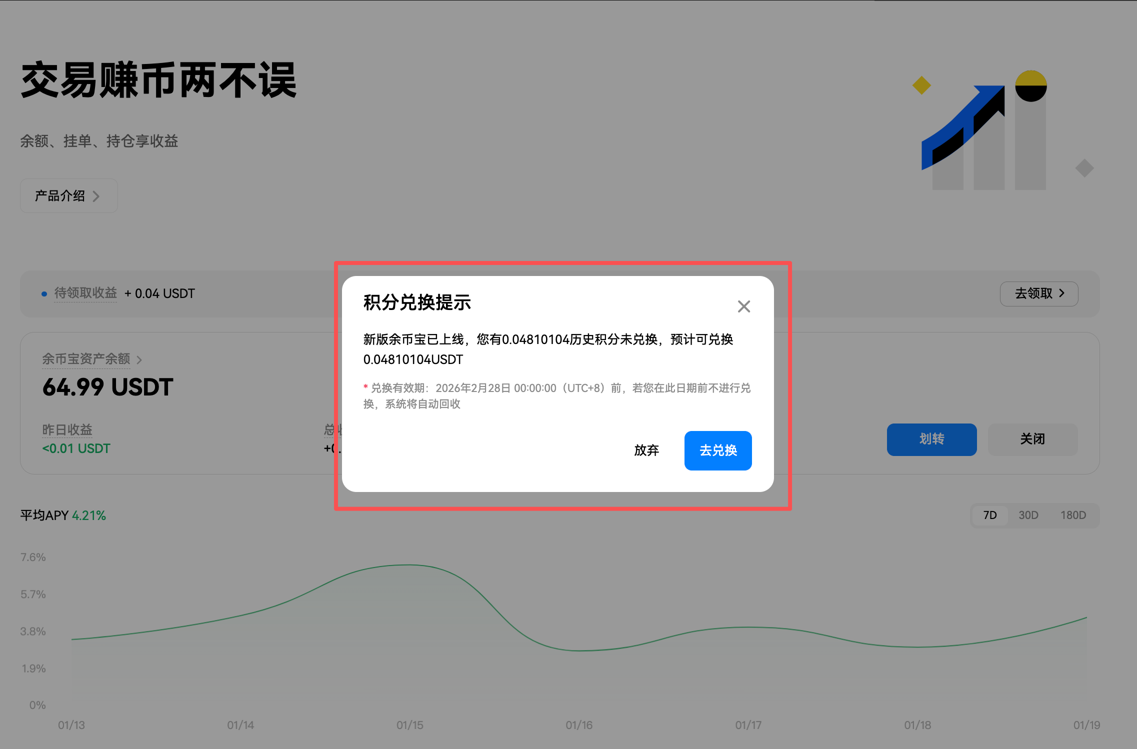 请注意,旧版余币宝收益积分需要在 2026/2/28 00:00(UTC+8)前完成手动兑换,过期仍未兑换的积分平台将进行回收处理。