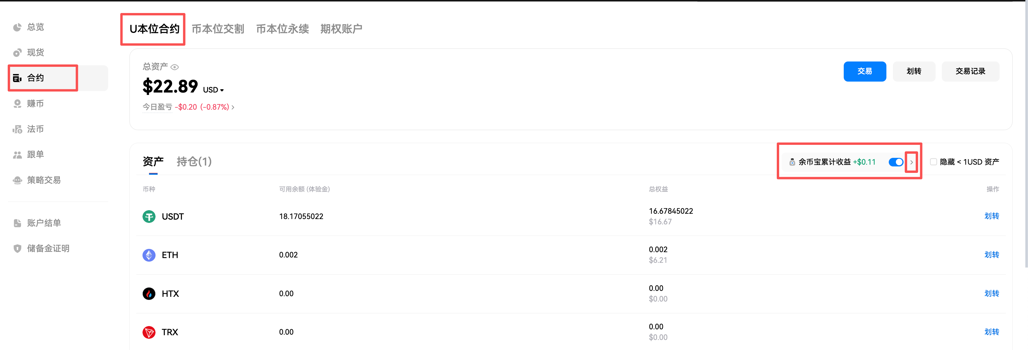 2)资产页-- 合约账户--U本位合约账户--”余币宝”入口