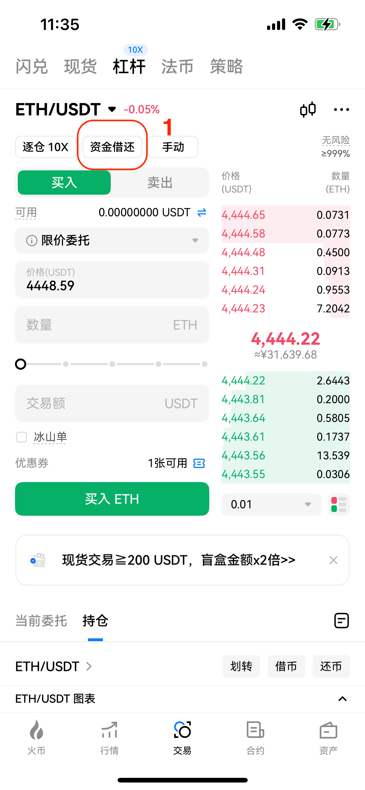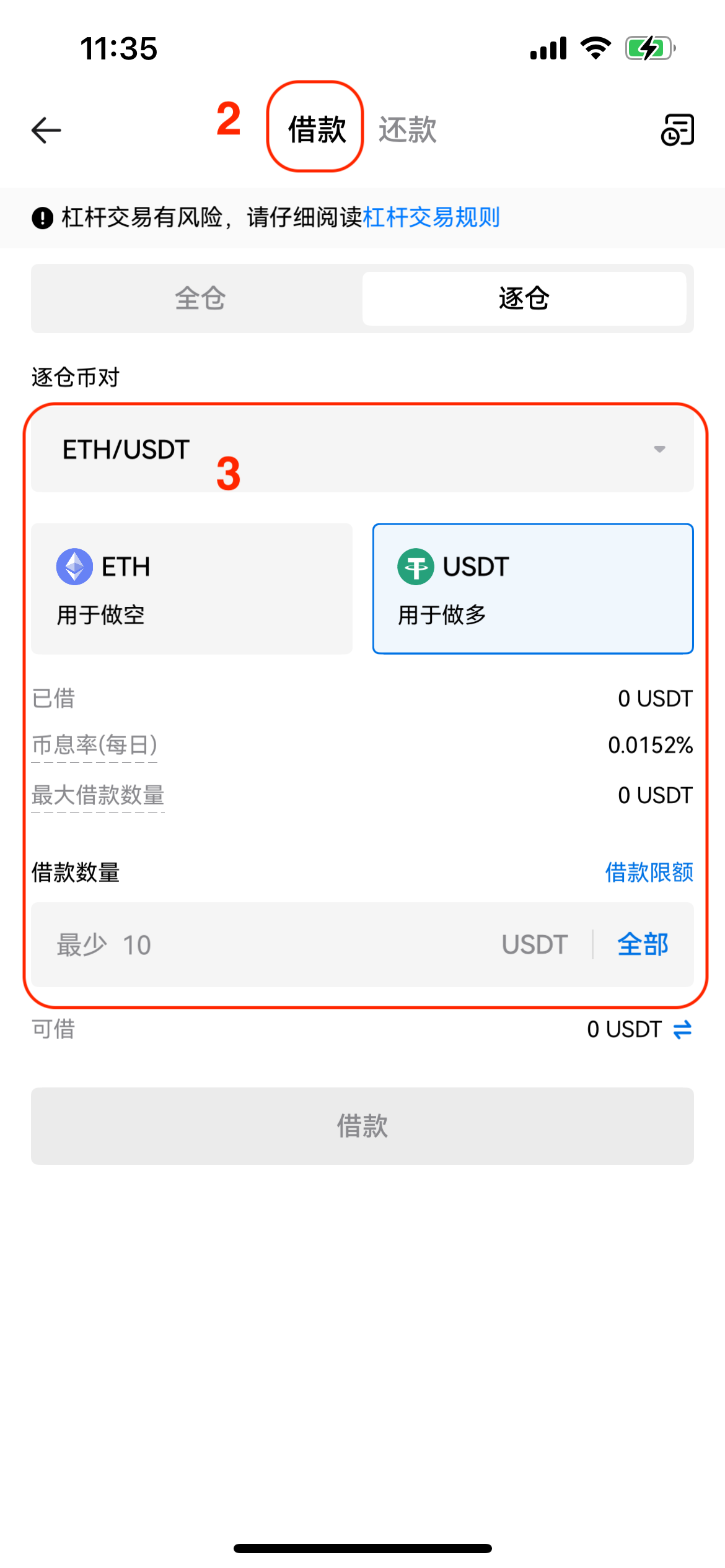 将资产划转到杠杆账户作为保证金后,即可进行借币操作,点击借款为手动借款模式;