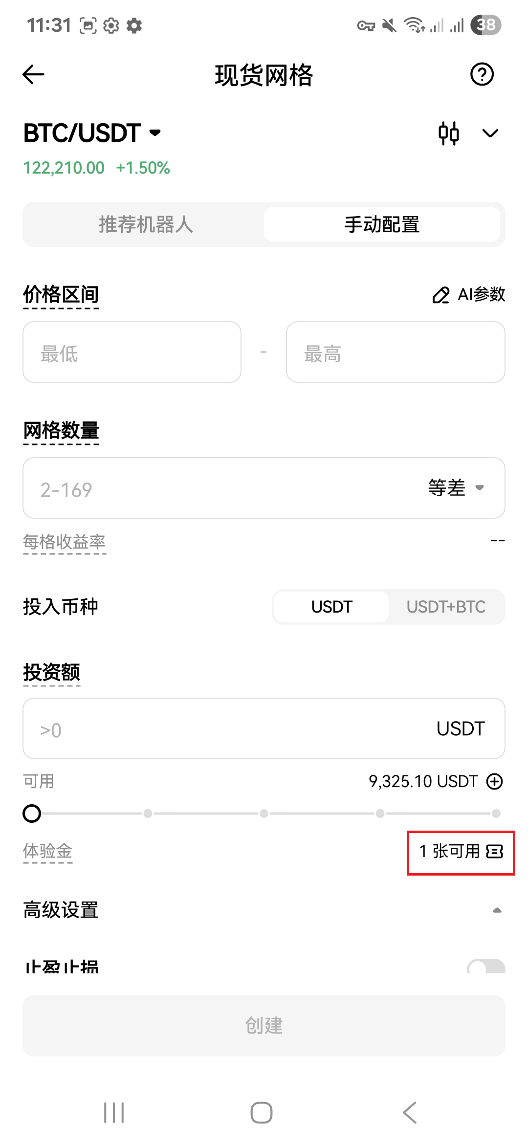 1.打开现货网格创建机器人中,可在投资额下方查看现货网格体验金券数量。