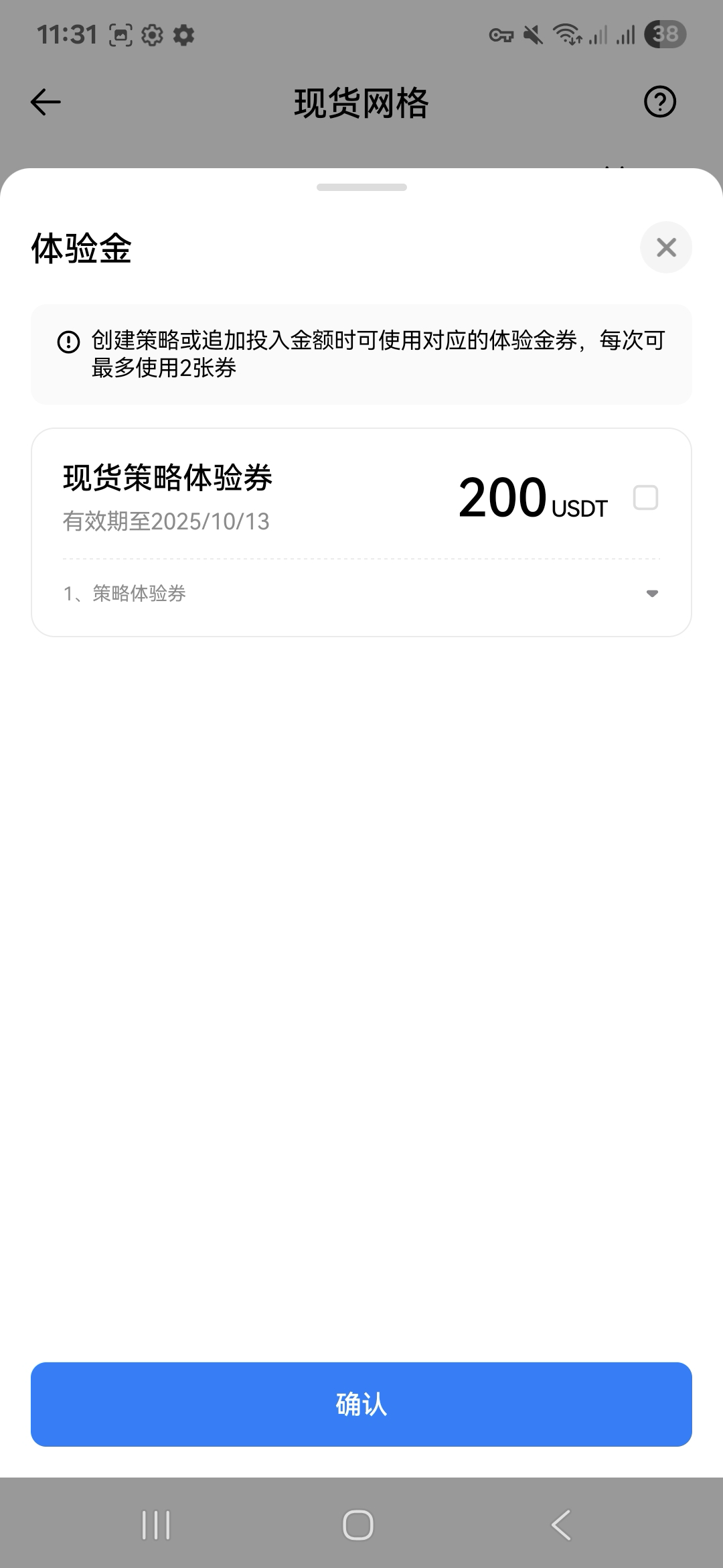 2.每个现货网格策略暂时只支持最多2张现货网格体验金券的使用