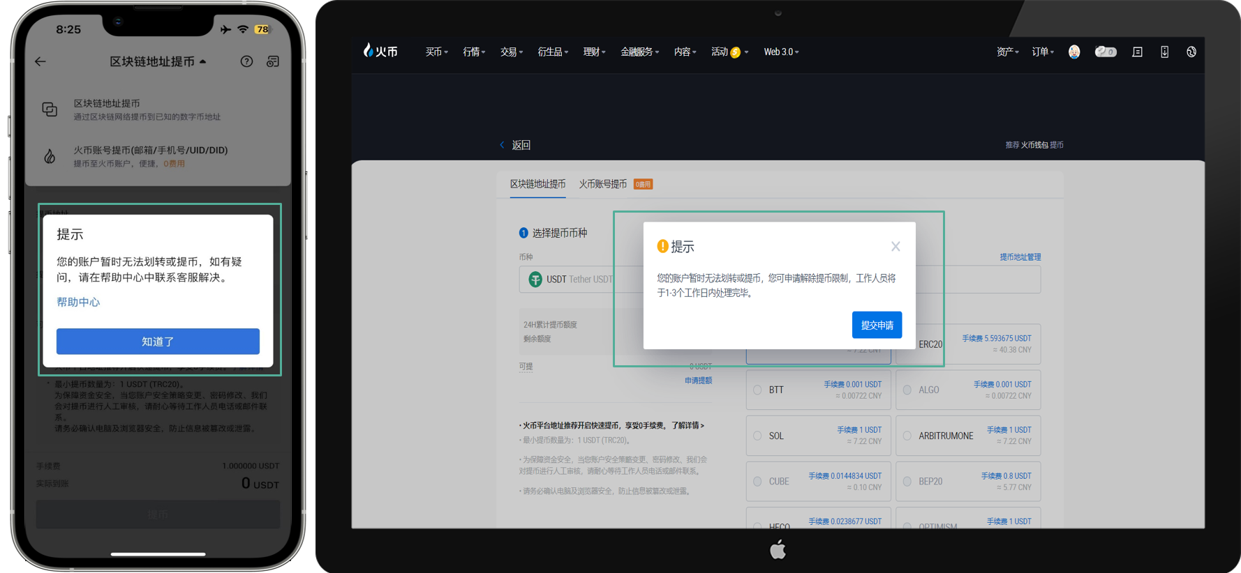 - 资产从火币提币到风险地址;
