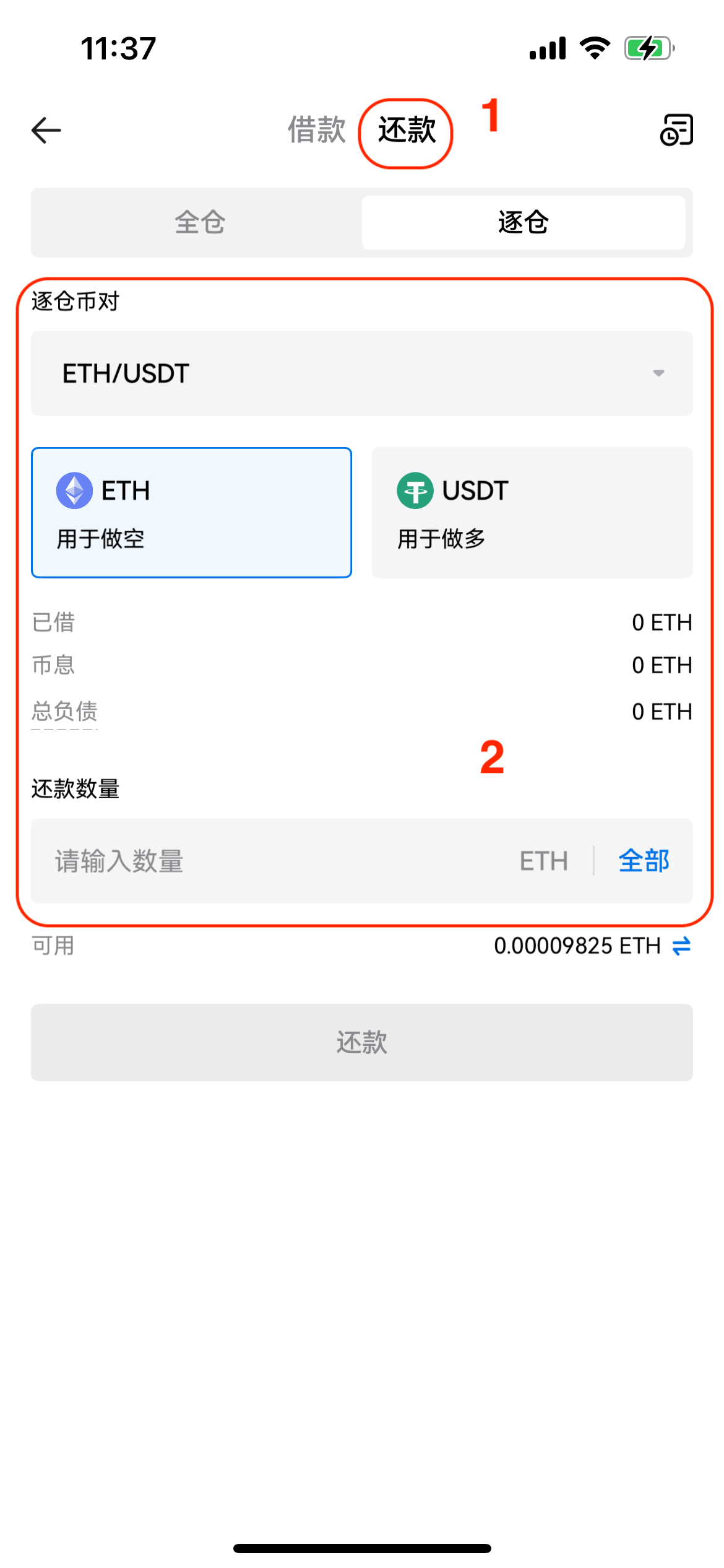 第一步:在杠杆交易界面点击持仓面板下的【还款】,在弹出的归还界面中选择【待归还币种】,输入【归还数量】。界面中会显示用户在指定币种下的已借资金、应计利息以及总应还数量。